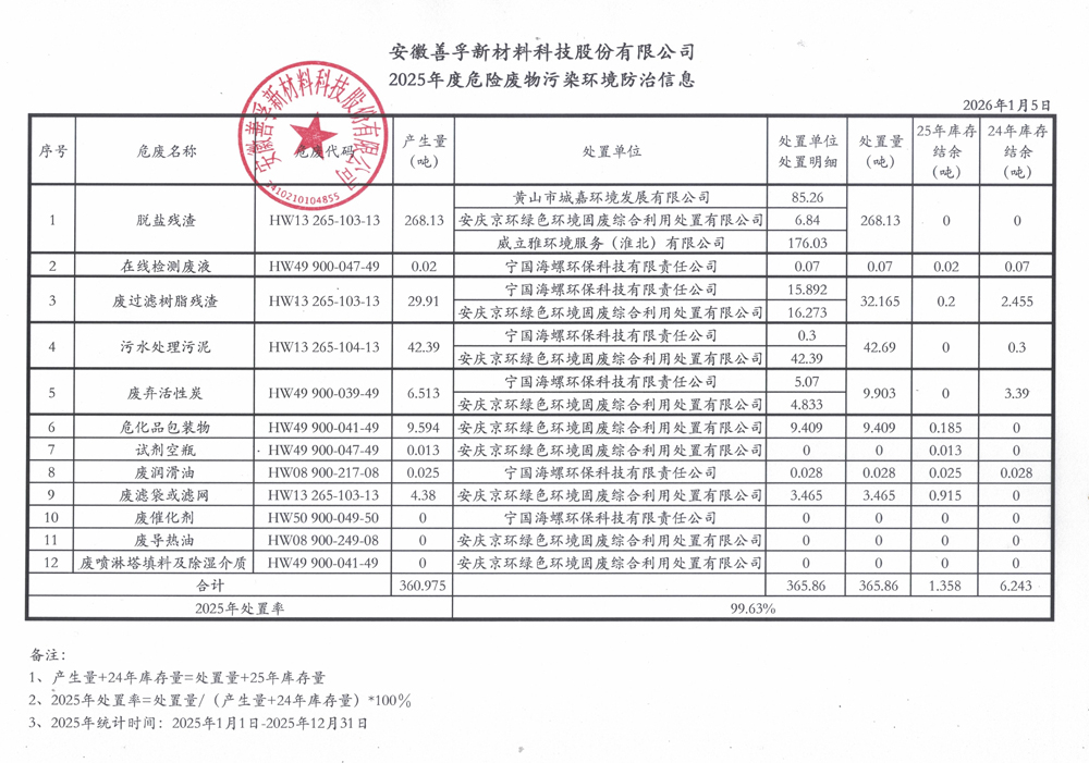 安徽善孚新材料科技股份有限公司2025年度危险废物污染环境防治信息